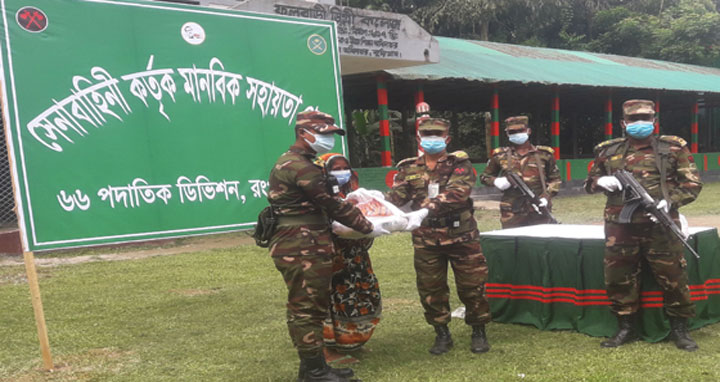 এ সময় সেখানে উপস্থিত ছিলেন ক্যাম্প কমান্ডার ক্যাপ্টেন সাকিব সালমান ও সিনিয়র ওয়ারেন্ট অফিসার শেখ মাহাবুবুল মুর্শেদ। হতদরিদ্রদের প্রত্যেককে ৫কেজি চাল, ১ কেজি আটা, ৫শ গ্রাম ডাল, ৫শ গ্রাম তেল, লবণ ও সাবান দেওয়া হয়।
