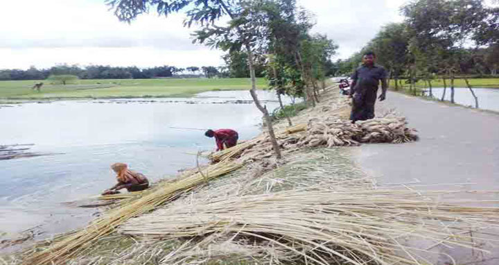 নীলফামারী (ডিমলা প্রতিনিধি) : সোনালী আঁশ পাটের অতীত ঐতিহ্য হারাতে বসলেও সেই রেখেছে ডিমলা উপজেলার কৃষক। এ বছর পাটের আবাদ বেড়েছে গত বছরে পাটের দাম ভাল পাওয়ায়। পাটের ফলনও ভালো হয়েছে। বিভিন্ন ডোবা-নালা আর খাল-বিলে আঁটি বেঁধে বর্ষার পানিতে পাট জাগ দেওয়া নিয়ে ব্যস্ত পাট চাষিরা। নির্দিষ্ট সময়ে যারা পাটের বীজ বপন করেছিলেন, তারা অবশ্য পাট জাগ থেকে তুলে আঁশ ছাড়াতে শুরু করেছেন। পাট চাষি জানান, পাট রোপণ থেকে জাগ দেওয়া এবং ধোওয়া পর্যন্ত কৃষকের বিঘাপ্রতি খরচ হয়েছে ৫ থেকে ৬ হাজার টাকা। মৌসুম অনুযায়ী বীজ রোপণ করলে বিঘাপ্রতি পাট উৎপাদন হয় ৮ মণ। আবার অনেকেই ইরি ধান কাটা-মাড়াইয়ের পর রোপণ করেন। তারাও পান বিঘাপ্রতি ৬ থেকে ৭ মণ পাট। পাট বোনার ১শত দিনের মাথায় তা কাটার উপযোগী হয়ে ওঠে। পাট কেটে ডোবাতে আঁটি বেঁধে তা ১৫ থেকে ১৬ দিন পচনের জন্য রাখতে হয়। আঁটিগুলো পানিতে ডুবিয়ে তার ওপর কচুরি পানা দিতে হয়, যাতে সূর্যের আলো না পড়ে। ডোবার কিনারে বসে কৃষকেরা পচনধরা পাটের আঁটিগুলো থেকে আঁশগুলো ছড়িয়ে নিয়ে তা আবার পেঁচিয়ে রাখছেন। পাটের আঁশ শুকনোর পাশাপাশি তার পাটখড়িগুলোও শুকাচ্ছেন তারা। পাটের সঙ্গে ভাল দাম পাচ্ছেন তারা পাটখড়ির, এক মণ পাটখড়ি বিক্রি হচ্ছে ৩০০ থেকে ৪০০ টাকায়।