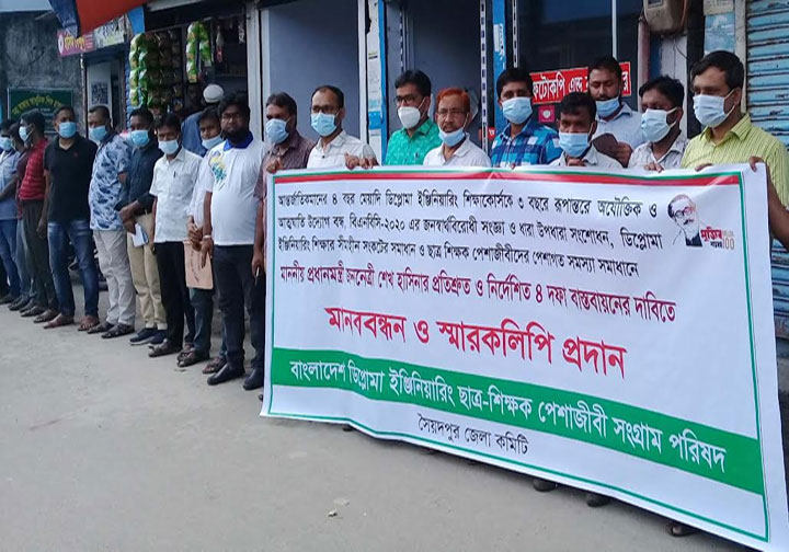 চিকলী নিউজ : আন্তর্জাতিকমানের ৪ বছর মেয়াদি ডিপ্লোমা ইঞ্জিনিয়ারিং শিক্ষাকোর্সকে ৩ বছরে রুপান্তরে অযৌক্তিক ও আত্নঘাতি উদ্যোগ বন্ধ, বিএনবিসি-২০২০ এর জন স্বার্থবিরোধী সংজ্ঞা ও ধারা-উপধারা সংশোধন, ডিপ্লোমা ইঞ্জিনিয়ারিং শিক্ষার সীমাহীন সংকটের সমাধান ও ছাত্র-শিক্ষক পেশাজীবীদের পেশাগত সমস্যা সমাধানে প্রধানমন্ত্রী শেখ হাসিনার প্রতিশ্র“তি ও নির্দেশিত ৪ দফা বাস্তবায়নের দাবিতে মানববন্ধন ও স্বারকলিপি প্রদান করা হয়েছে। ১৫ সেপ্টেম্বর বুধবার বেলা ১১ টা থেকে ১২ টা পর্যন্ত নীলফামারীর সৈয়দপুর প্রেসক্লাবের সামনে এ কর্মসূচি পালন করেছে বাংলাদেশ ডিপ্লোামা ইঞ্জিনিয়ারিং ছাত্র-শিক্ষক পেশাজীবী সংগ্রাম পরিষদ, সৈয়দপুর জেলা শাখা।