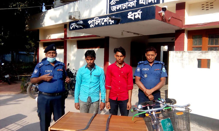 জলঢাকা প্রতিনিধি : নীলফামারীর জলঢাকায় দেশীয় অস্ত্র সহ ২ জন আটক। আজ বুধবার সন্ধ্যায় উপজেলার কাঠাঁলী ইউনিয়নের বিন্যাবাড়ী বাজার থেকে তাদের অস্ত্র সহ আটক করে পুলিশ। ঘটনার এজাহার ও পুলিশ সুত্রে জানাযায়, আটককৃত আসামীরা কাঠাঁলী ইউনিয়নের বিন্যাবাড়ী বাজারের মাছ বিক্রেতা জেনারুলের দোকানের সামনে এসে অকথ্য ভাষায় কাকে যেন গালি গালাজ করলে জেনারুল তাদের মুসল্লীরা নামাজ পরছে তাই সরে যাওয়ার জন্য বলে। পরে মুসল্লীরা সরগোলের কারন জানতে চাইলে জেনারেল তাদের নাম বললে আসামীরা বিভিন্ন ধরনের হুমকি দিয়ে চলে গিয়ে তারা দেশীয় অস্ত্র সহ দলগত ভাবে এসে জেনারেলকে তার দোকান হতে জোর পূর্বক তুহিন চেয়ারম্যানের চাতালে নিয়ে এলোপাতাড়ি কিল ঘুসি মারতে থাকে।
