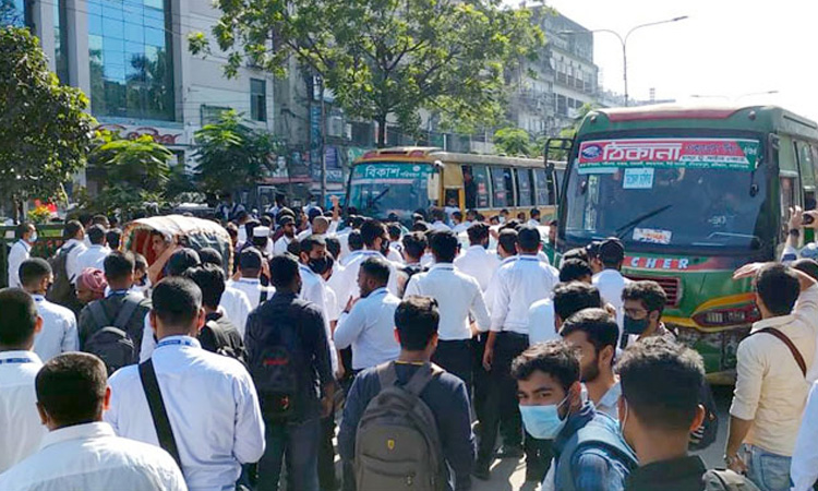 এ সময় অবিলম্বে হাফ ভাড়া কার্যকর করাসহ শিক্ষার্থীদের সঙ্গে পরিবহন শ্রমিকদের দুর্ব্যবহার বন্ধের দাবিতে শিক্ষার্থীদের বিভিন্ন স্লোগান দিতে দেখা যায়। এ সময় বেশ কয়েকটি গাড়িও আটকে রাখেন শিক্ষার্থীরা।