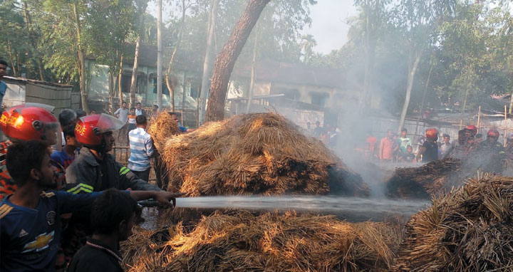 চিকলী নিউজ : নীলফামারীর সৈয়দপুরে ধানের মন্ডপে আগুন লাগিয়ে ধান পুড়ে ছাই হয়ে গেছে। গতকাল দুপুরে শহরের হাতীখানা বানিয়াপাড়া এলাকায় এ মর্মান্তিক ঘটনাটি ঘটে। এতে করে পুড়ে ছাই হয়েছে কৃষকের স্বপ্ন। এ ঘঁনা এলাকায় চাঞ্চল্য সৃষ্টি হয়েছে। জানা যায়, প্রায় ২০ থেকে ২৫ দিন পূর্বে আমন ধানকেটে ওই এলাকার মসজিদের পাশে পরিত্যাক্ত জমিতে প্রায় ৮ থেকে ১০ জন কৃষক তাঁদের ধান মন্ডপ করে রাখে। ঘটনার দিন দুপুরে কে বা কাহারা একটি ধানের মন্ডপে আগুন লাগিয়ে দেয়। ওই আগুন দ্রুত অন্যান্য মন্ডপে ছড়িয়ে পড়লে এত করে কৃষক শাহজাহান, আজিজার ও হানিফের ধানের মন্ডপ পুড়ে ছাই হয়ে যায়।