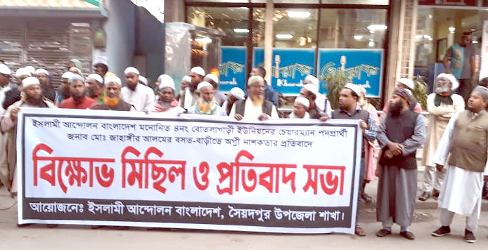 চিকলী নিউজ ।। নীলফামারীর সৈয়দপুরে ইউনিয়ন পরিষদ নির্বাচনে চেয়ারম্যান প্রার্থীর বাড়িতে মধ্যরাতে অগ্নিকান্ডের প্রতিবাদে গত ১৩ ডিসেম্বর ২০২১ ইং তারিখে বিকাল সাড়ে ৪টার বিক্ষোভ মিছিল ও প্রতিবাদ সভা অনুষ্ঠিত হয়। ইসলামী আন্দোলন বাংলাদেশ, সৈয়দপুর উপজেলা শাখার উদ্যোগ উক্ত বিক্ষোভ মিছিলটি শহরের প্রধান প্রধান সড়ক প্রদক্ষিণ শেষে প্রতিবাদ সভা অনুষ্ঠিত হয়।