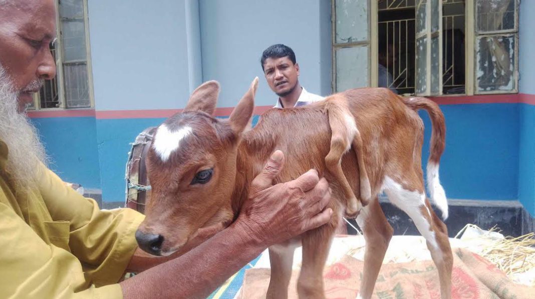 জানা যায়, মঙ্গলবার সকালে উপজেলার বামুনিয়া কাচারী এলাকায় আছির উদ্দীনের ছেলে মনছুর মিস্ত্রীর বাড়িতে একটি গাভী ওই বাছুরটির জন্ম দেয়। চারটি পা ঠিক জায়গা মতো থাকলেও বাছুরটির পিঠে অতিরিক্ত ২টি পা দেখা যায়।
