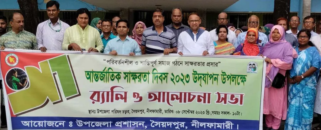 বেলা ১০টায় সৈয়দপুর উপজেলা পরিষদ মিলনায়তনে “পরিবর্তনশীল ও শান্তিপূর্ণ সমাজ গঠনে সাক্ষরতার প্রসার” দিবসের এবারের প্রতিপাদ্যের ওপর ওই আলোচনা সভা অনুষ্ঠিত হয়েছে। সৈয়দপুর উপজেলা নির্বাহী অফিসার (ইউএনও) ফয়সাল রায়হানের সভাপতিত্বে অনুষ্ঠিত আলোচনা সভায় স্বাগত বক্তব্য দেন উপজেলা শিক্ষা অফিসার মো. জাকির হোসেন সরকার।