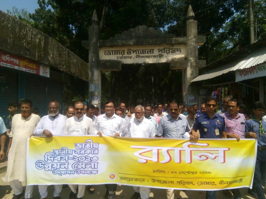 আনিফ রহমান, ডোমার (নীলফামারী) : জাতীয় স্থানীয় সরকার দিবস উন্নয়ন মেলা ২০২৩ উপলক্ষে ১৭ই সেপ্টেম্বর, নীলফামারী ডোমার উপজেলার আয়োজনে আনন্দ র‍্যালী ও আলোচনা সভার আয়োজন করা হয়। এ অনুষ্ঠানে প্রধান অতিথি হিসেবে উপস্থিত ছিলেন ডোমার-ডিমলার জাতীয়  সংসদ সদস্য আলহাজ্ব জনাব মোঃ আফতাব উদ্দিন সরকার এবং বিশেষ অতিথি হিসেবে উপস্থিত ছিলেন ডোমার উপজেলার চেয়ারম্যান, জনাব তোফায়েল আহমেদ, এবং সভাপতিত্ব করেন ডোমার উপজেলা নির্বাহী অফিসার জনাব নাজমুল আলম বিপিএএ।