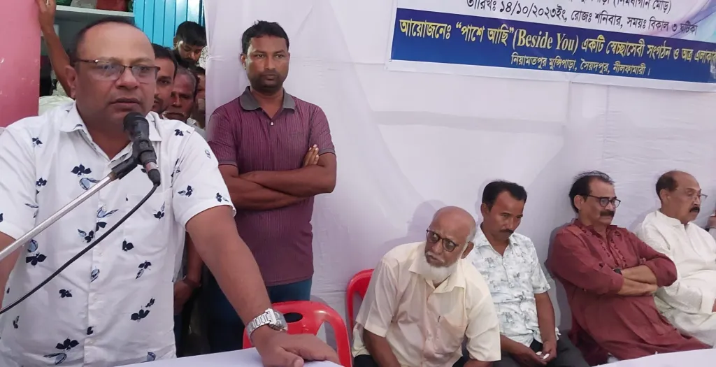 পাশে আছি সংগঠনের সাধারণ সম্পাদক মালেক-উজ- জামান সবুজের সঞ্চালনায় অন্যান্যদের মধ্যে বক্তব্য রাখেন সৈয়দপুর উপজেলা আওয়ামীলীগের অন্যতম নেতা সাবেক অধ্যক্ষ সাখাওয়াত হোসেন খোকন, আজকের পত্রিকার নীলফামারী জেলা প্রতিনিধি জসিম উদ্দিন, সৈয়দপুর পৌরসভার সংরক্ষিত ওয়ার্ড কাউন্সিলর কাজী জাহানারা, কাউন্সিলর মোহাম্মদ আলী, কাজী নজরুল ইসলাম রয়েল, বেলাল হোসেন প্রমূখ।