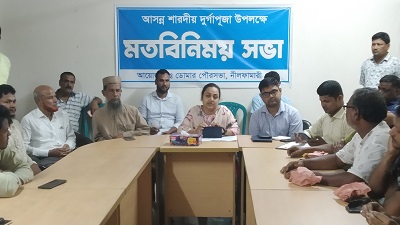 ডোমার প্রতিনিধি : নীলফামারীর ডোমারে আসন্ন শারদীয় দুর্গাপূজা উপলক্ষে পৌর প্রশাসকের সাথে পূজা উদযাপন কমিটির নেতৃবৃন্দের এক মতবিনিময় সভা অনুষ্ঠিত হয়েছে।