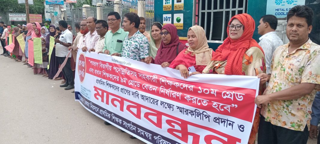 এতে প্রধান শিক্ষক আসাদুজ্জামান বাবু, লেবু, ইন্দু ভূষন রায়, সহকারী শিক্ষক মনিরুজ্জামান মনি, সন্তোষ রায়, লিমন হোসেন, সাফিনা আক্তার সাথী বক্তব্য দেন। মানববন্ধনে উল্লেখ করা হয় প্রাথমিক বিদ্যালয়ের সহকারী শিক্ষক নিয়োগের যোগ্যতা স্নাতক সম্মান আর বেতন গ্রেড ১৩তম অথচ অষ্টম শ্রেণি পাশ ড্রাইভার ভাইদের বেতন গ্রেড ১২তম।