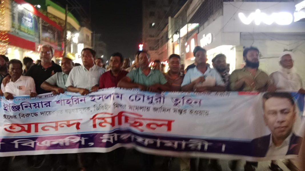 চিকলী নিউজ : সাবেক সংসদ সদস্য প্রকৌশলী শাহরিন ইসলাম চৌধুরী তুহিনের মুক্তিতে নীলফামারীতে আনন্দ মিছিল ও মিষ্টি বিতরণ করেছে জেলা বিএনপি। বৃহস্পতিবার সন্ধ্যায় জেলা বিএনপিসহ অঙ্গ সংগঠনের নেতাকর্মীদের অংশগ্রহনে দলীয় কার্যালয়ের সামনে থেকে মিছিলটি শহরের প্রধান সড়ক প্রদক্ষিণ শেষে সেখানে ফিরে সমাবেশে মিলিত হয়।