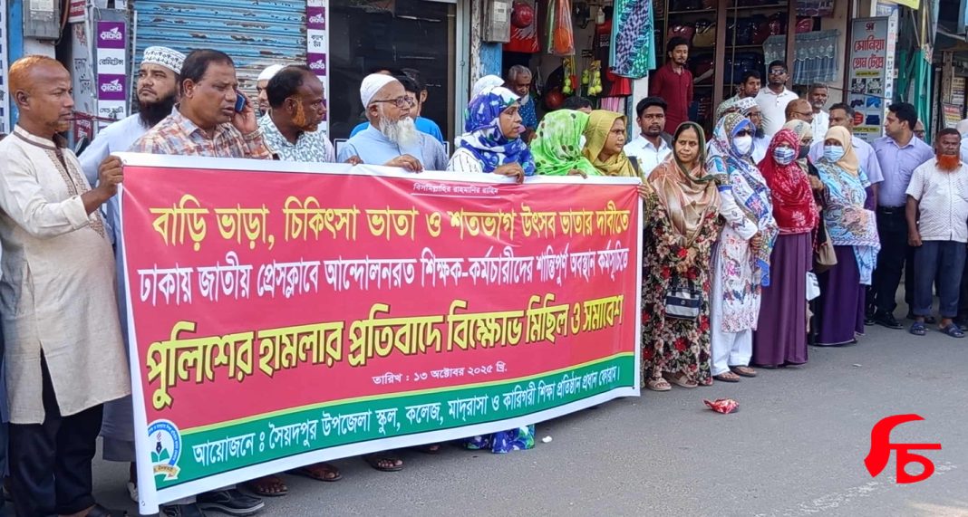 এসময় সৈয়দপুর উপজেলার ৫৪টি শিক্ষাপ্রতিষ্ঠানের প্রধান শিক্ষক সহকারী শিক্ষকসহ শিক্ষাপ্রতিষ্ঠানে কর্মচারীবৃন্দ। এসময় বক্তারা বলেন ঢাকা প্রেসক্লাবের সামনে যেসব পুলিশ শিক্ষকদের লাঞ্চিত করেছেন তাদের দ্রুত আইনের আওতায় আনতে হবে। ক্রীড়া উপদেষ্টা আসিফ মাহমুদ সজীব ভুইয়ার বক্তব্যের তীব্র নিন্দা জানানো হয় এবং উপস্থিত শিক্ষক ফোরামের নেতারা হুশিয়ারি দিয়ে বলেন উপদেষ্টা ইউটিউব দেখে শিক্ষাপ্রতিষ্ঠানে শিক্ষার্থীদের পাঠদানের পরামর্শ দেন। শিক্ষকদের প্রয়োজন নেই ইউটিউব দেখে কি শিক্ষার্থীরা পড়াশোনা করতে পারবে?