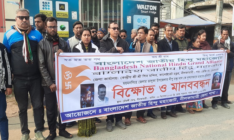 চিকলী নিউজ : ময়মনসিংহের ভালুকায় দিপু চন্দ্র দাসকে নৃশংসভাবে হত্যার প্রতিবাদে নীলফামারীতে মানববন্ধন ও প্রতিবাদ সমাবেশ অনুষ্ঠিত হয়েছে। শুক্রবার (২৬ডিসেম্বর) সকালে শহরের চৌরঙ্গি মোড়ে বাংলাদেশ জাতীয় হিন্দু মহাজোটের ব্যানারে এই কর্মসুচি পালিত হয়। সংগঠনের জেলা সভাপতি জুয়েল রায়ের সভাপতিত্বে বক্তব্য দেন সংগঠনের উপদেষ্টা হিরম্ব কুমার রায় ও পরিতোষ চন্দ্র রায়। প্রতিবাদ সভায় দিপু দাসের হত্যাকাণ্ডের তীব্র নিন্দা জানানো হয়।