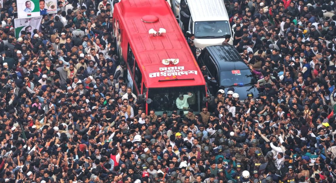 লাল-সবুজ পতাকার রঙে সাজানো বাসের সামনে দাঁড়িয়ে হাত নেড়ে তারেক রহমান কর্মীদের শুভেচ্ছা জানান। বাস ঘিরে কর্মী-সমর্থকদের প্রচণ্ড ভিড়ের কারণে আট কিলোমিটার পথ পাড়ি দিতে লেগে যায় পৌনে ২ ঘণ্টা।